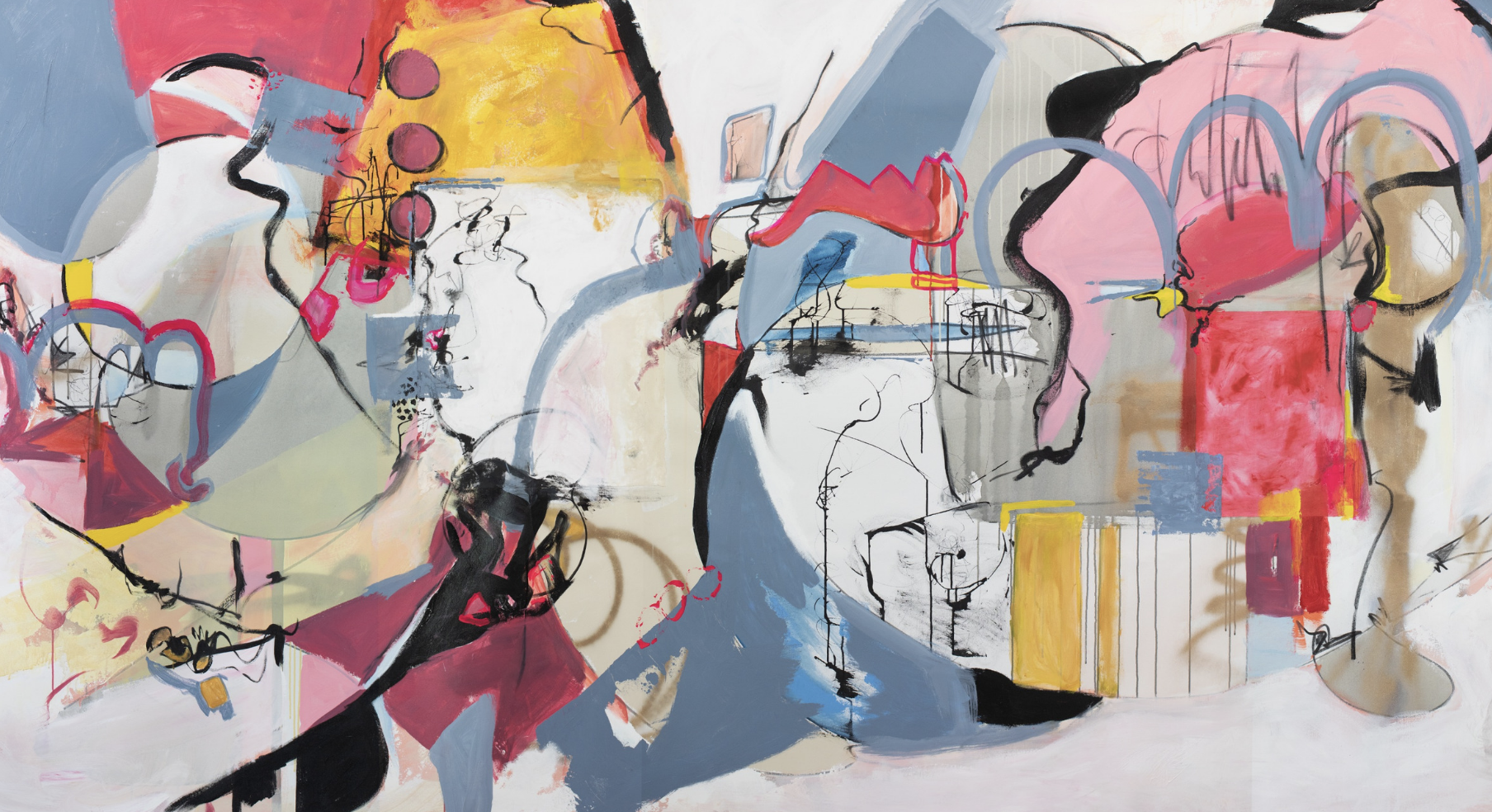 Carousel (2023) is a vibrant and evocative work by Donna Isham, created in collaboration with musician Mark Isham. Measuring 61 by 71 1/2 inches, the piece reflects childhood memories of park visits and carousel rides. The dynamic color palette of creamy yellows, muted blues, crimson, and pinks captures the carefree, spinning motion of these rides, evoking the ecstatic thrill children experience. By combining acrylic, graphite, oil stick, and ink, Isham creates a textured, multi-layered surface that invites viewers to immerse themselves in her nostalgic recollections and the universal joy of carousel experiences.