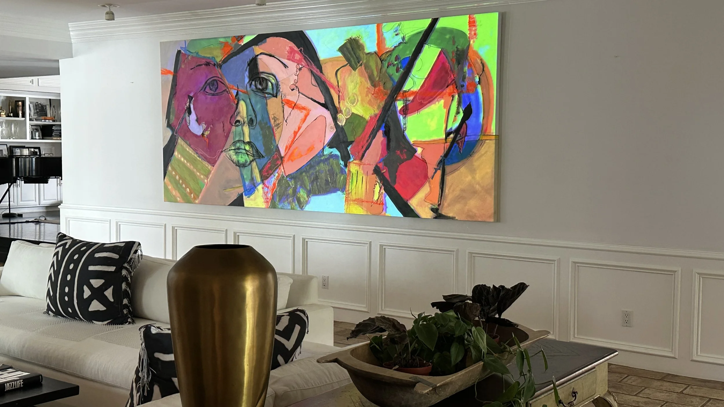 Le Cirque (2024) is an immersive fusion of dynamic artistry, 3D animation, projection mapping, and an original musical score. Spanning 60 by 140 inches, it harnesses the circus as a metaphor for life’s inherent unpredictability—beauty and grit, thrill and danger—revealing the delicate balance between control and chaos. In vivid, discordant hues, Donna Isham merges figuration and abstraction, layering angular black lines, abstract shapes, and circular motifs to explore identity, deconstruction, and the fluid nature of self-discovery.